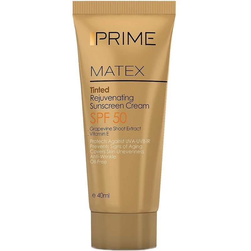کرم ضد آفتاب رنگی SPF50 پرایم Matex با حجم ۴۰ میلیلیتر، دارای رنگی متناسب با پوست است و از آن در برابر اشعههای IR، UVA و UVB با فاکتور محافظتی PA+++ مراقبت میکند. این کرم حاوی ویتامین E بوده و خواص آنتی اکسیدانی دارد که منجر به آبرسانی بیشتر و کندی روند پیری پوست میشود. همچنین لکهای پوستی را پوشانده و آن را یکدست و زیبا به نمایش میگذارد.
