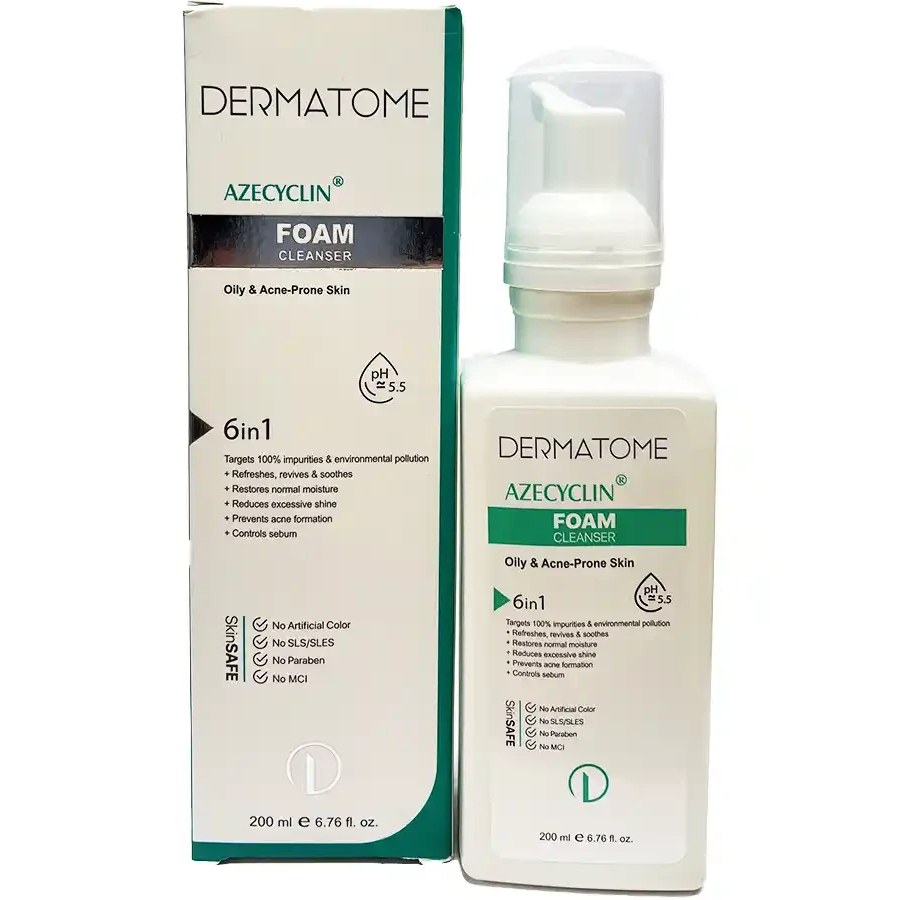 فوم شوینده و پاک کننده آزسایکلین درماتوم با حجم ۱۵۰ میلی‌لیتر، یک فیس واش غیرصابونی است که برای پوست چرب، مختلط و مستعد آکنه مناسب است. این محصول ۶ کاره، با پاکسازی آلودگی‌های محیط و ذرات آرایشی باقی مانده از سطح پوست، پوستی شاداب و تمیز هدیه می‌دهد. همچنین، چربی پوست را کنترل می‌کند تا مانع از بروز جوش و آکنه شود. فوم آزسایکلین درماتوم pH طبیعی پوست و رطوبت طبیعی را حفظ می‌کند.