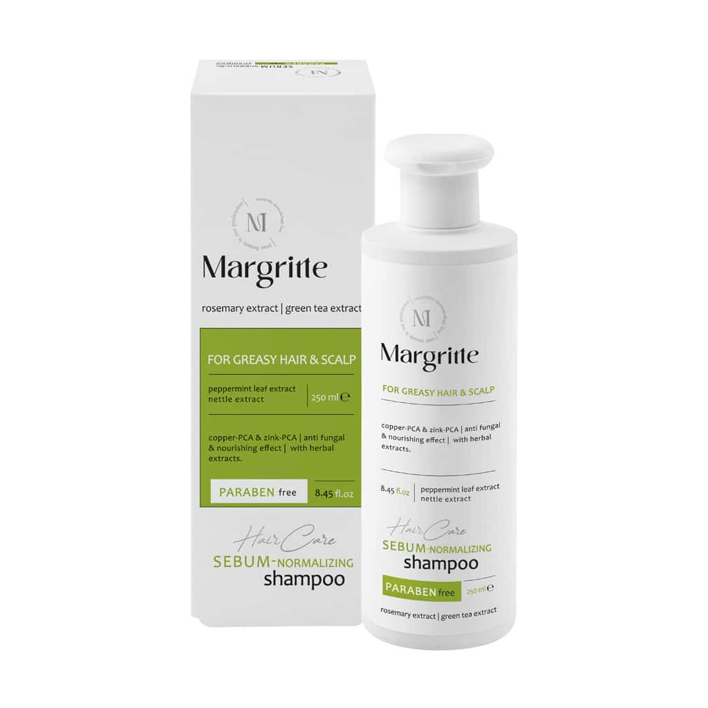 شامپو متعادل کننده چربی مارگریت حاوی ترکیبات ضد قارچ است. از شوره سر و پوسته پوسته شدن سر جلوگیری میکند و سلامت پوست سر را افزایش میدهد. دارای عصاره چای سبز، رزماری، گزنه، نعناع فلفلی و زینک پی سی ای است و ریشه مو را نیز تغذیه میکند. این برای موهای چرب مناسب است.